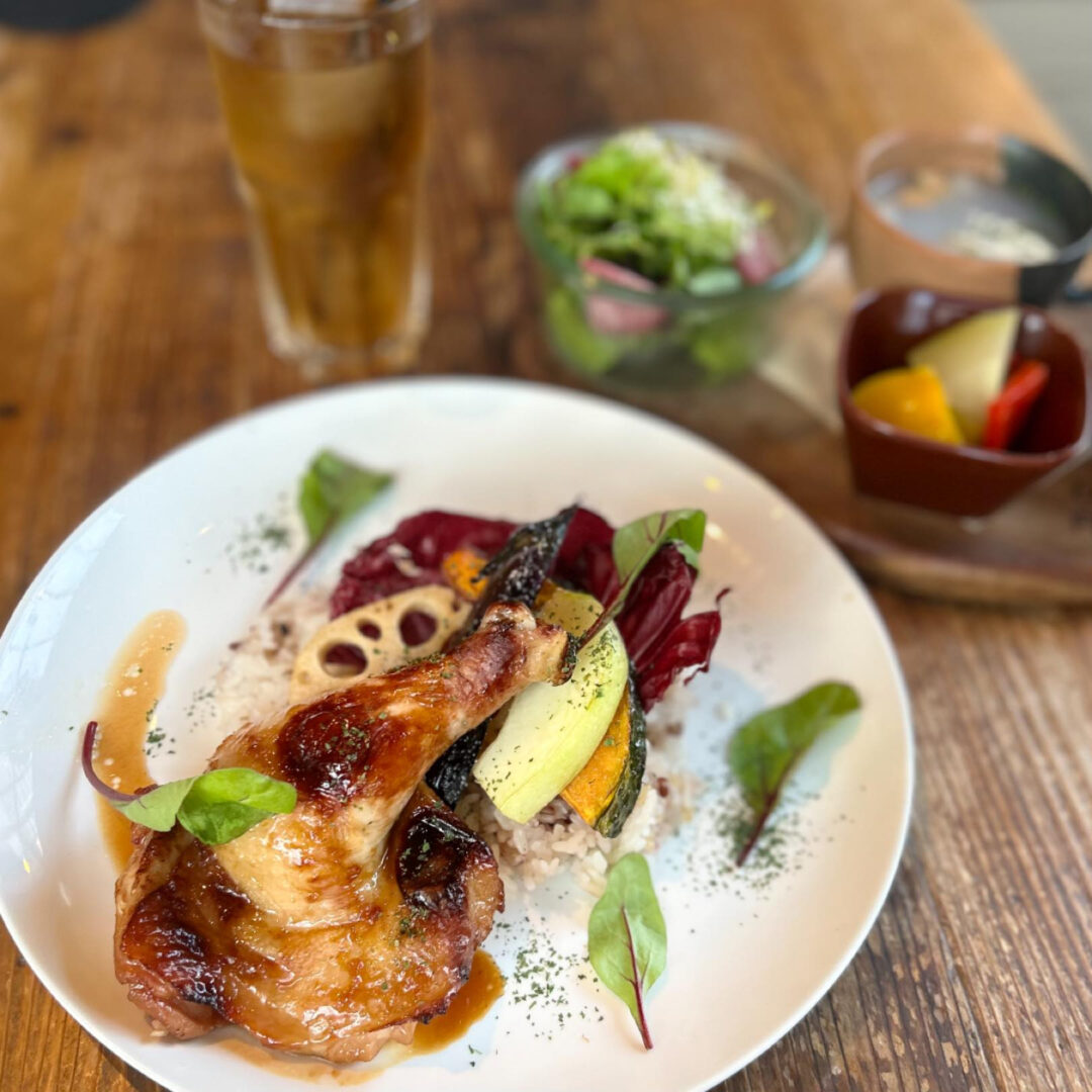 「骨付き鶏モモ肉のローストチキン 〜赤米ご飯のライスプレート〜」¥1780