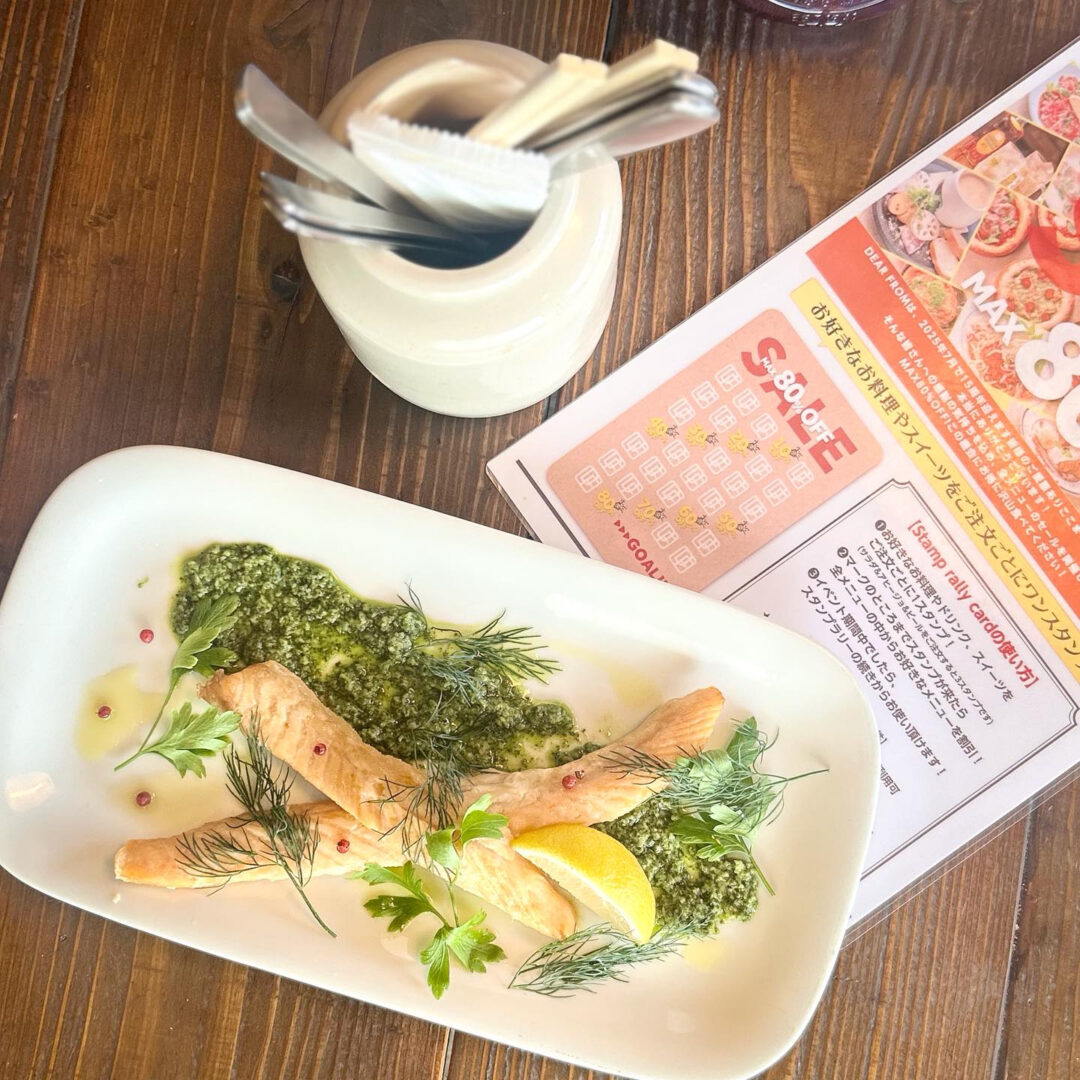 「ハラスサーモンのロースト 〜バジルペーストのソース〜」 ¥980