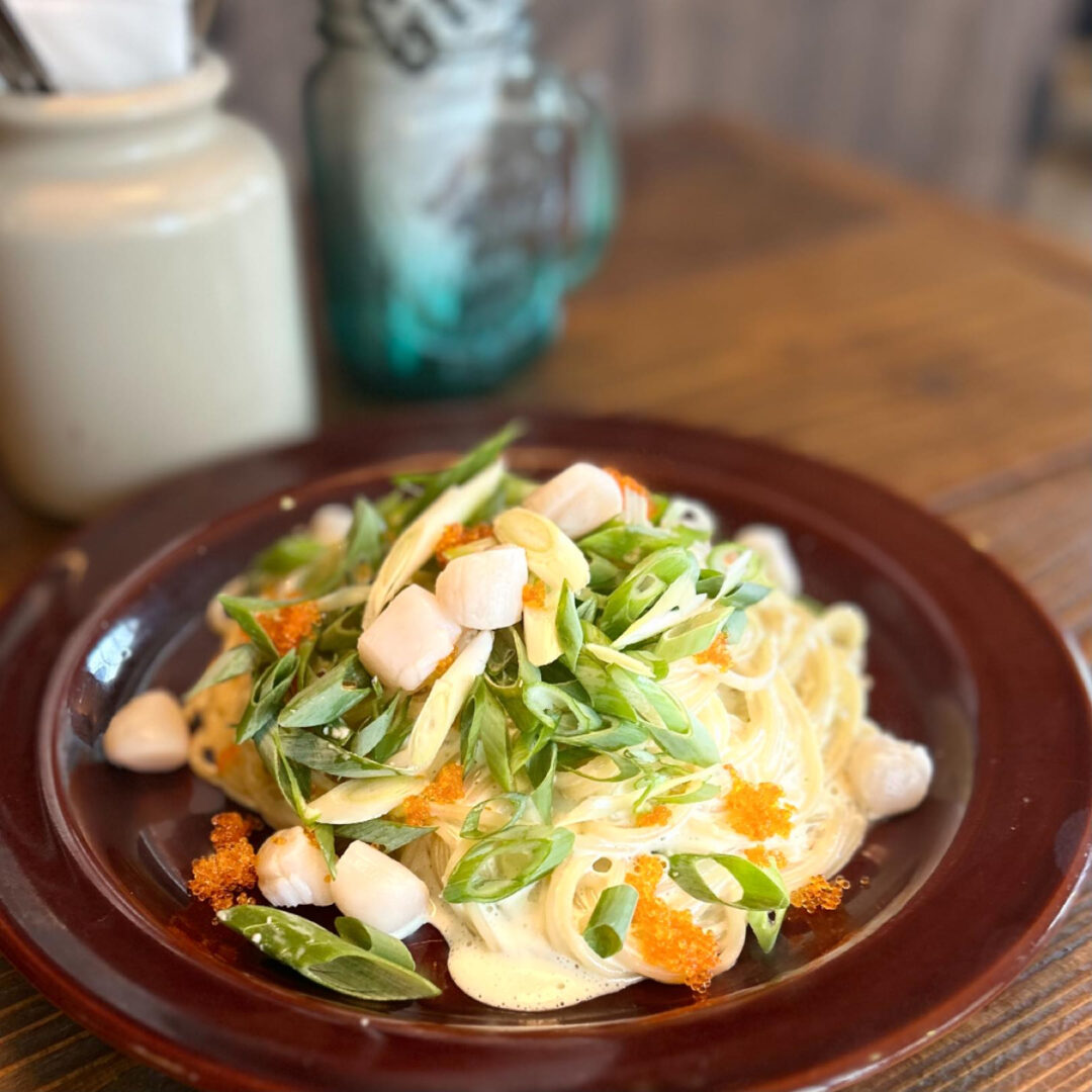 「ホタテ小柱と九条ネギのわさびマヨスパゲティ」(仮)